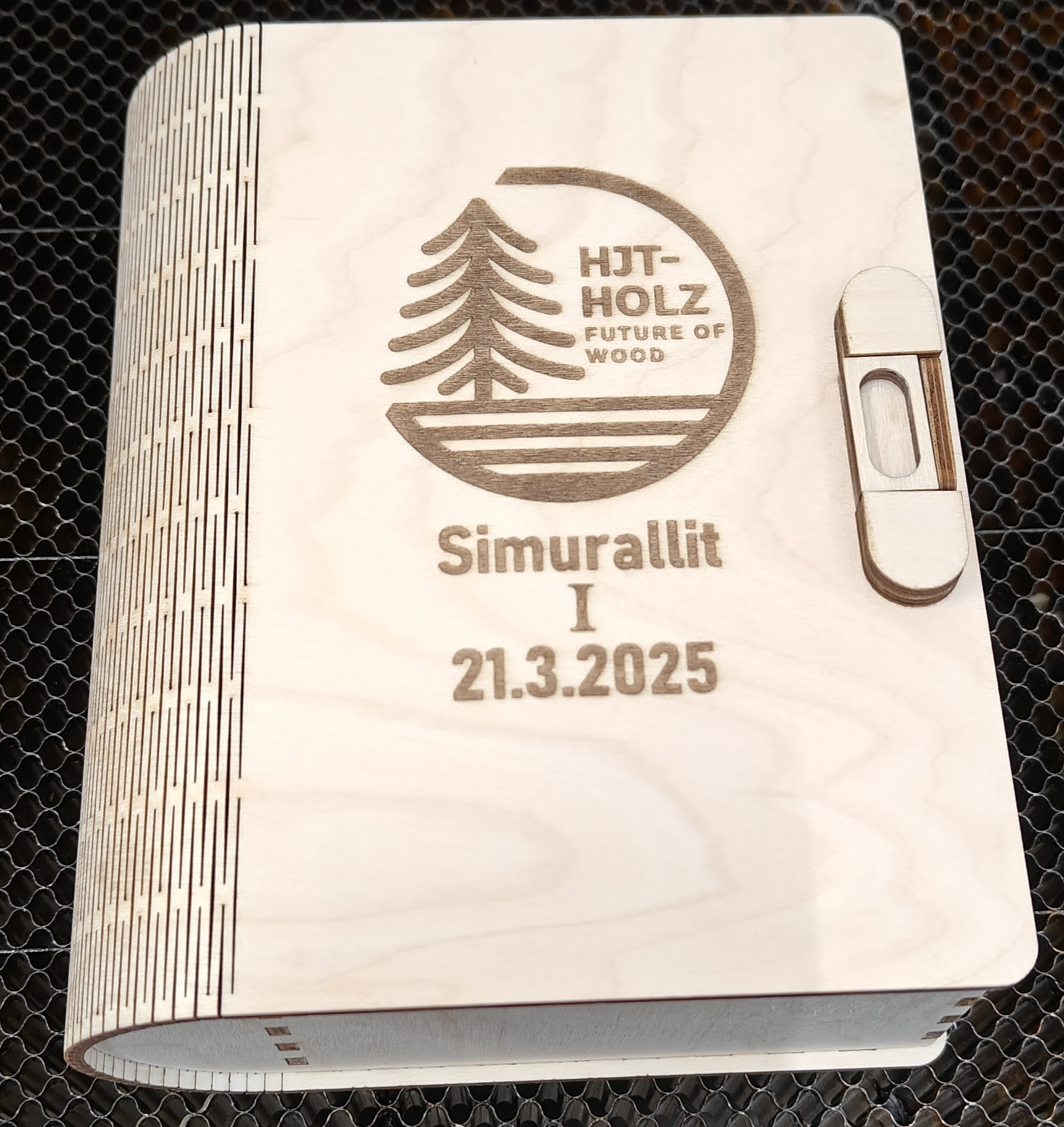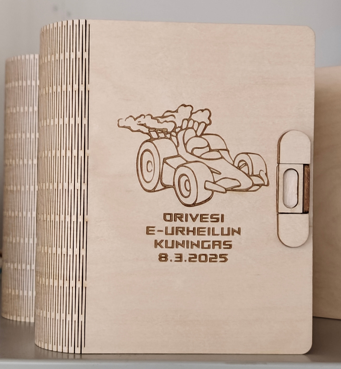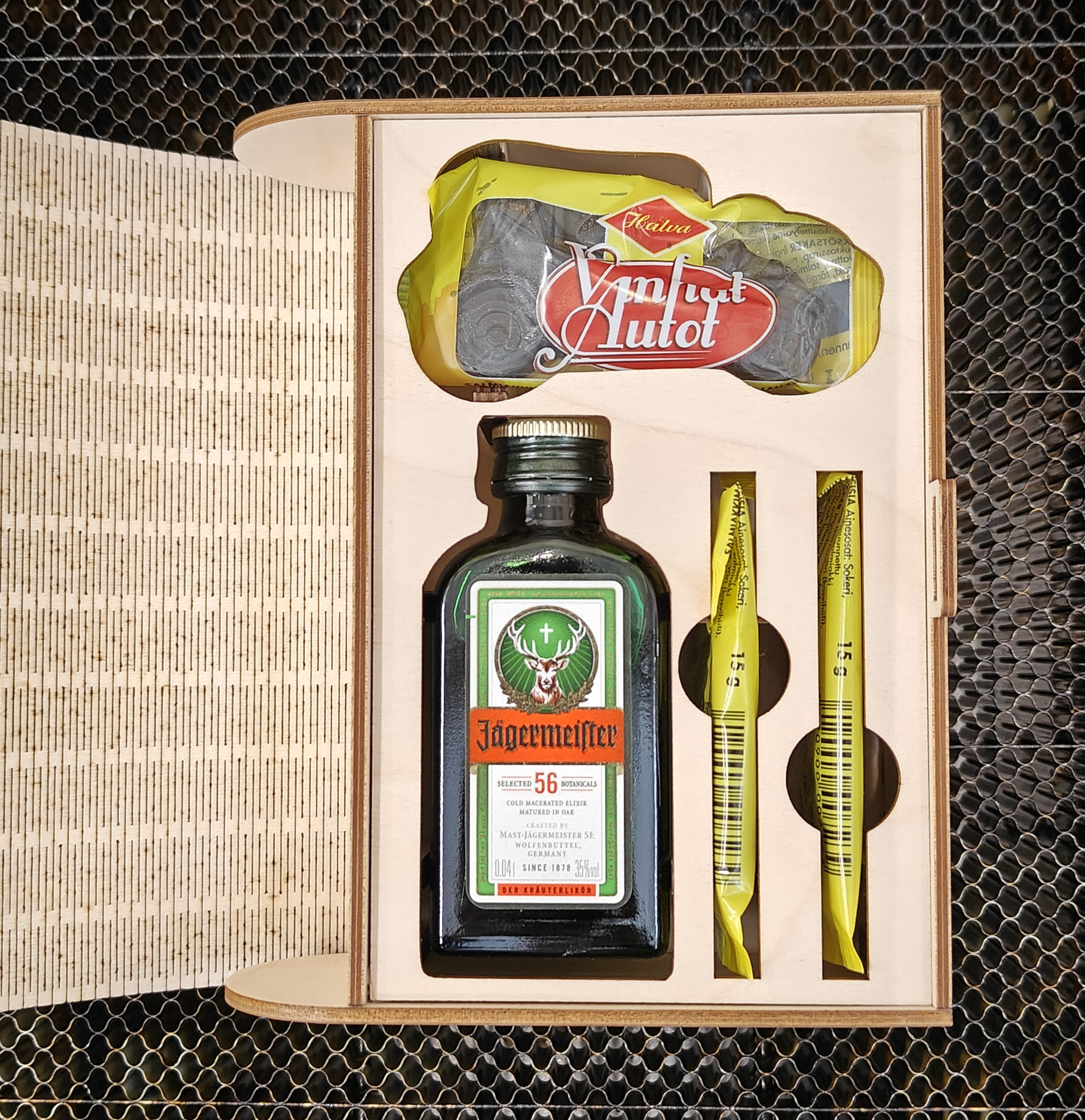 Kuvaus: Erikoispalkinto, sisällä paikat pienelle Jägermeister-pullolle ja kolmelle Vanhat autot-salmiakki-makeiselle. Kanteen asiakkaan haluama kaiverrus. Ilman sisältöä.